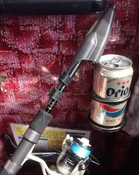 グヴィグヴィ呑みながら、車内で釣竿のセットも完了。あとは、現場でルアーを結ぶだけです。